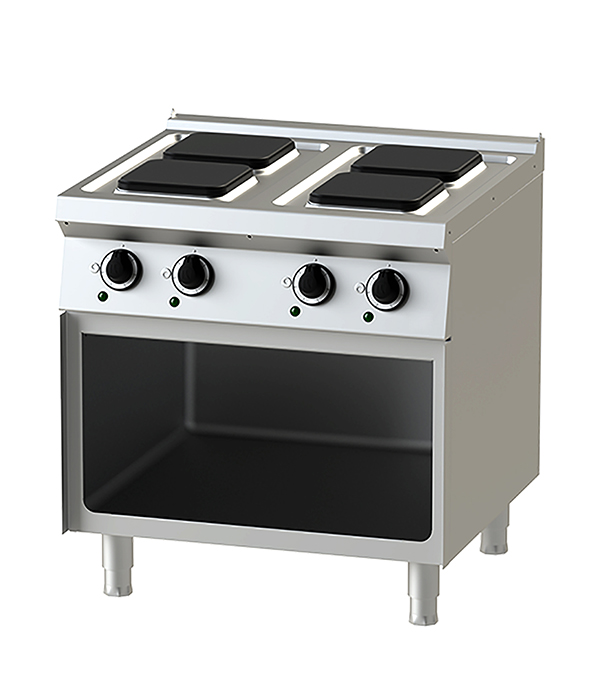 Modular electric hot plate with 750 mm depth, powered with 4 x 2.6 kW hot plate cast iron heaters. Equipped with open cabinet. Usable for boiling, steaming, frying, braising, simmering and steam frying. Made of AISI 304 with 1.5 mm top thickness, equipped with deep drawn collared square hot